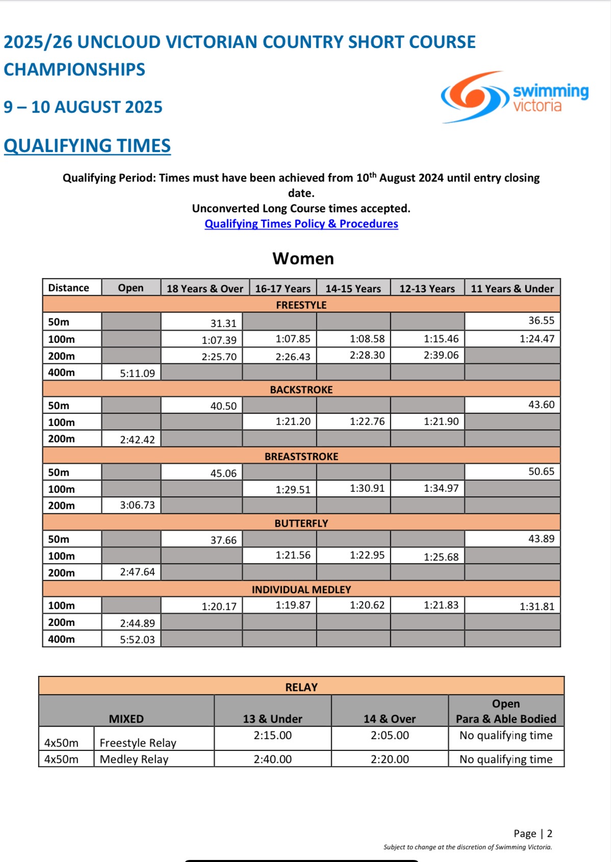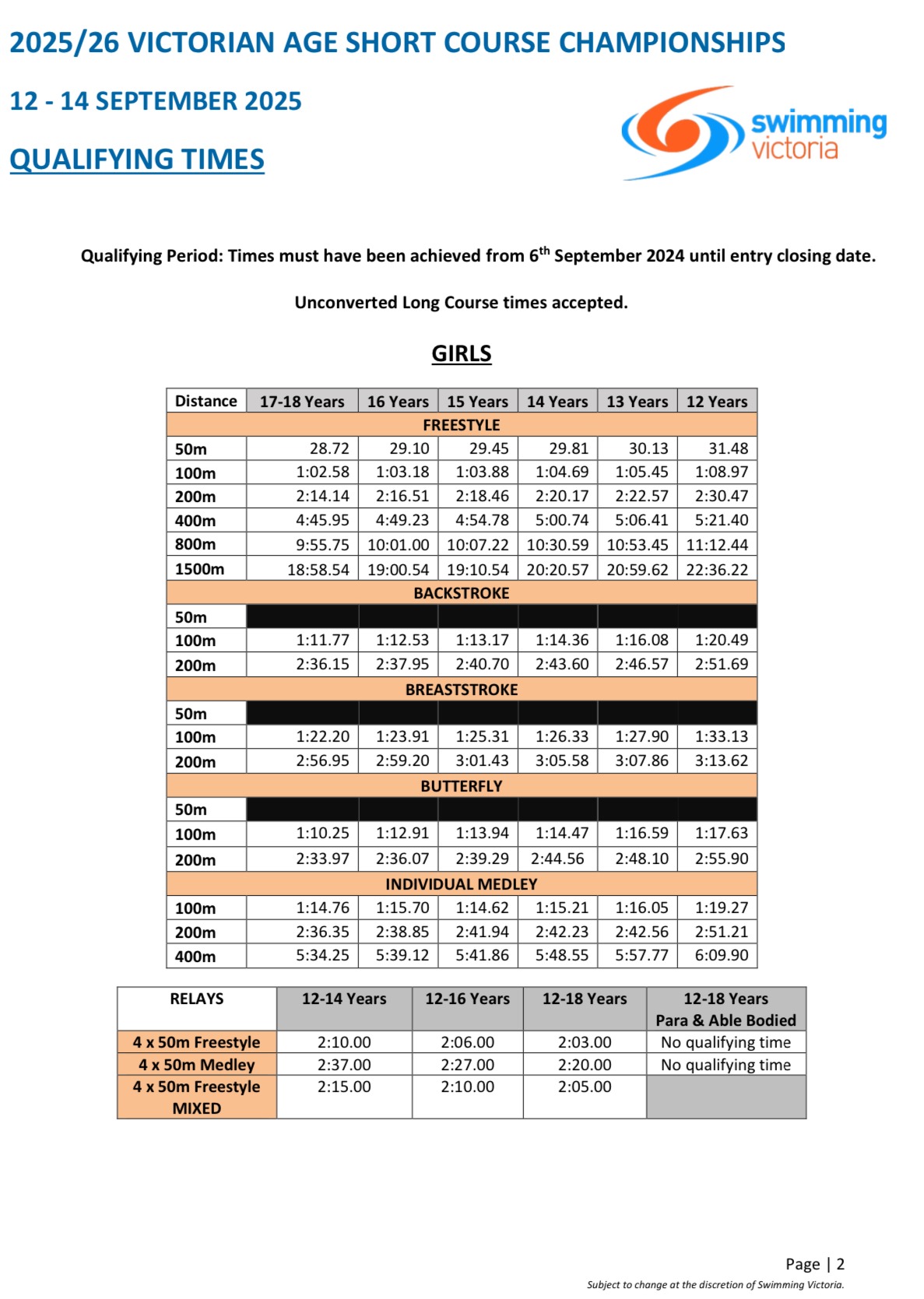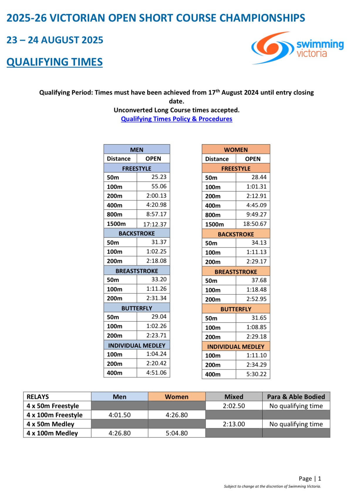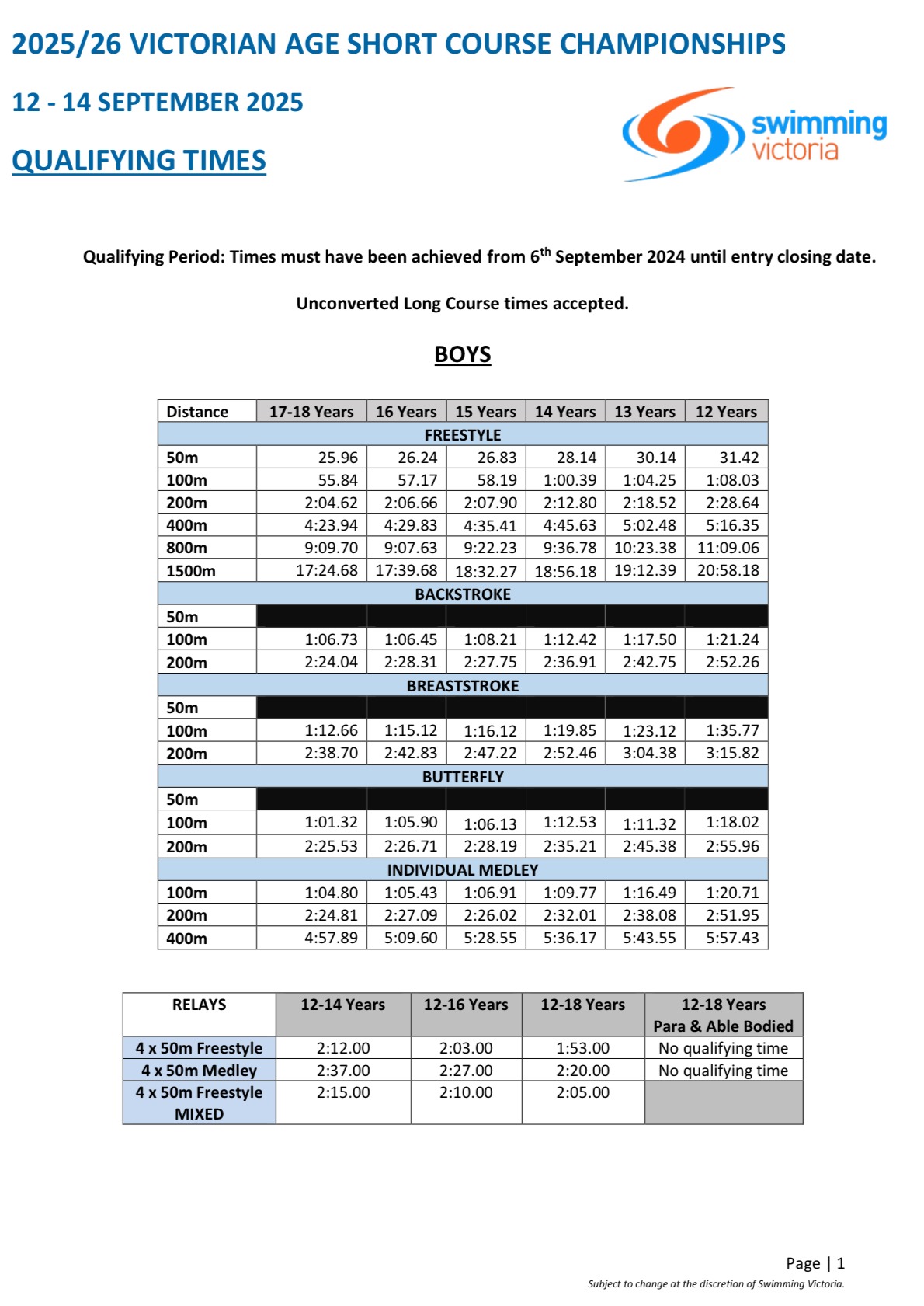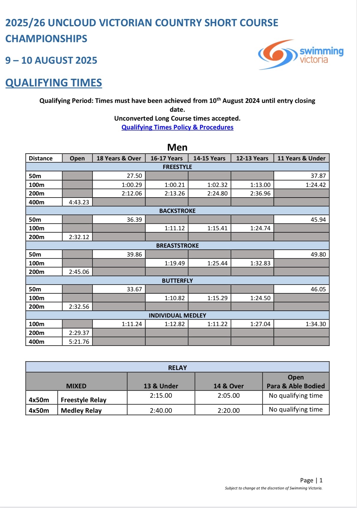 Championship meets all require swimmers to meet qualifying times to enter. Qualifying times are released at different times during the competition season and will be updated accordingly: